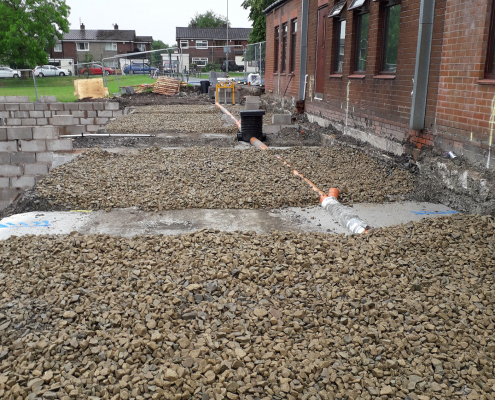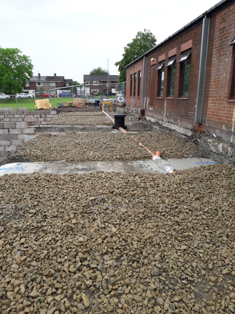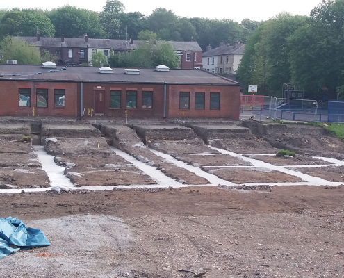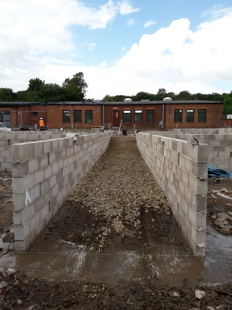 The groundworks and civils work included Bulk Excavation, Deep Strip Foundations, Drainage Diversions and Attenuation Tank, New MUGA Pitch, External Works and Surfacing.